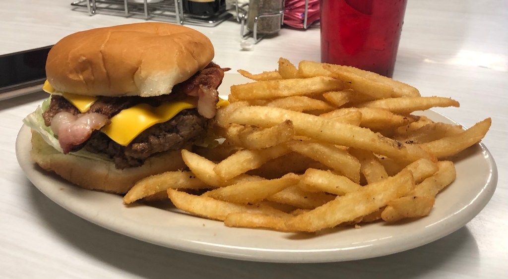 Kiley had a bacon 🥓 🍔 cheeseburger that was stacked high and followed through with taste. Also, the seasoned French fries were delicious!