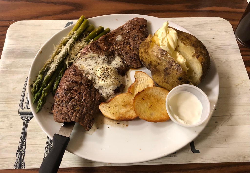 I had the 12 ounce ribeye, baked potato 🥔, asparagus with Parmesan and garlic toast. They placed a little blob of garlic butter on the 🥩 steak that really added to the flavor. A sweet tea to wash it down! Highly recommended. (The steak is thin, however, it is high quality.)
