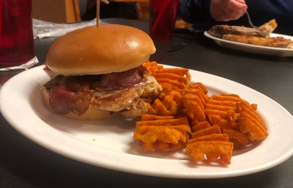 I had the grilled 🐔 chicken, 🥓 bacon 🧀 Swiss on a Kaiser roll and waffle 🍠 potato fries. Superb taste on the sandwich!