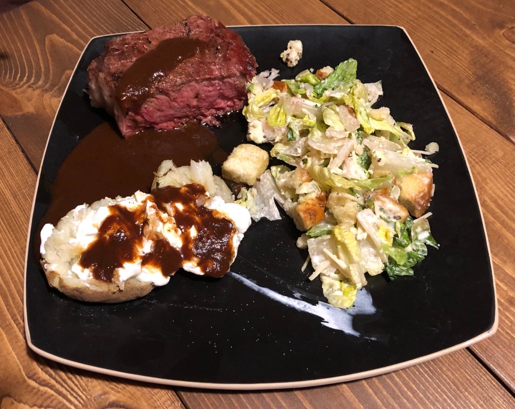 A.K.A. the Cowboy 🥩 steak, this nearly five pound hunk of ribeye on the 🍖 bone was grilled on indirect heat on the Weber Grill with charcoal and 🍎 applewood smoke. Bruce and I are believers that 🧄 garlic salt is all you need for a Terrific steak and he did an excellent job in this one as I was working at a basketball 🏀 game. (I retrieved these Tomahawks from Sam’s Club.)It’s 🥜 peanutbutter jelly time!!! For dessert we mixed a Nuttercup Porter and an Abita 🍓 Strawberry Lager. Quite delicious!This is Bruce Stahl’s plate. Medium rare steak 🥩 and doused with A1 Steak Sauce, along with a baked 🥔 potato , also with A1, and a Caesar 🥗 salad.