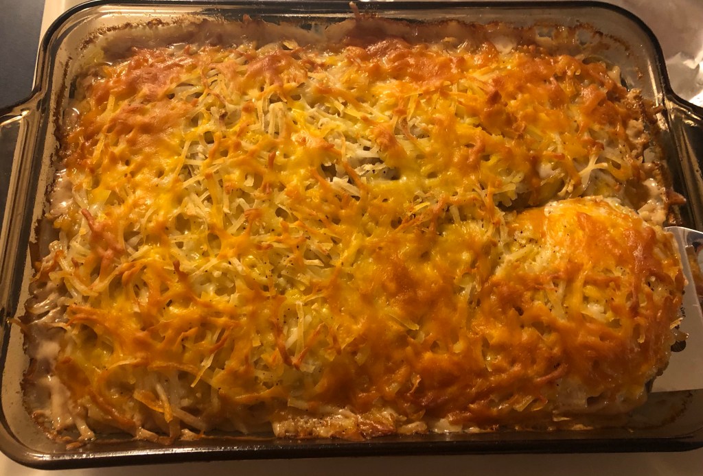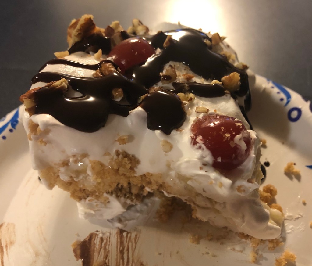 Green Bean Casserole for the win!!! Nina was saying she didn’t have Tater Tots so she mixed hash browns and cheese for the topping and it turned out wonderful. Nice and crispy!!!Green Bean Casserole on the right. Heidi and Nina have been making this Asian 🥗 slaw for years. Slaw mix and crunched up Ramen noodles with the dressing made up of the Ramen season packet mixed with oil, vinegar and some sugar. Delicious every time.Check this bad boy out! Banana Split no bake dessert. As soon as Nina said it had four cups of powdered sugar, I knew she couldn’t go wrong. Pineapple 🍍, 🍌 bananas, cherries 🍒, whipped cream and a Graham cracker crust. Whoop! Whoop! Added a little chocolate 🍫 syrup.