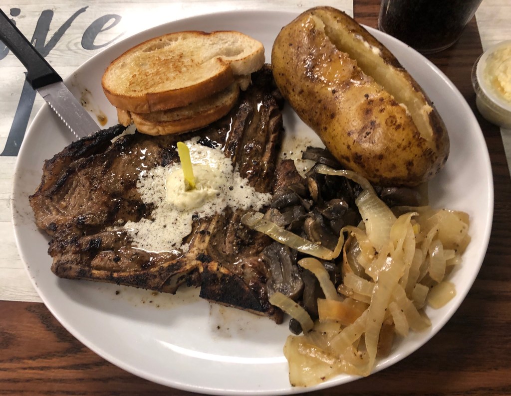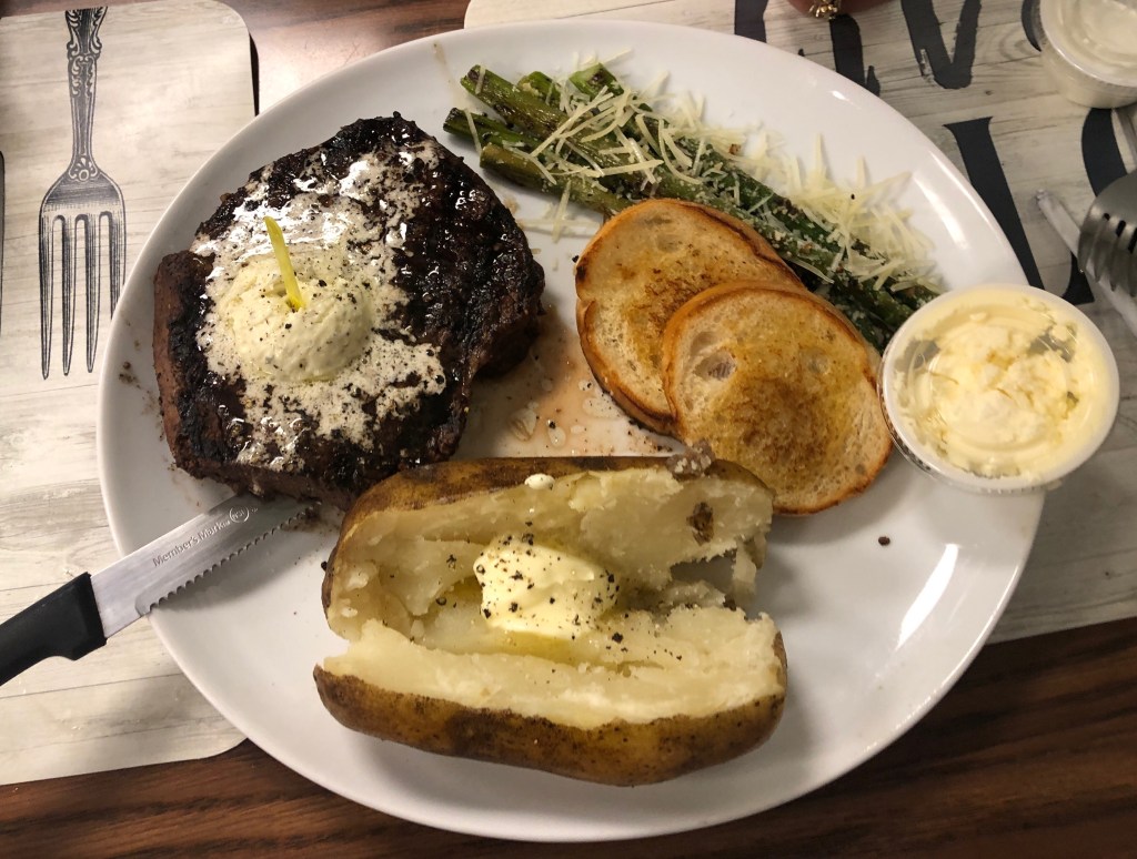 I had the 🥩 T-Bone, baked potato 🥔, 🍄 mushrooms and 🧅 onions, and 🧄 garlic toast. I ate everything on the plate! The garlic butter dollop on the steak sets it off the flavor and I enjoyed the toast and potato as much as anything.Heidi went for the filet mignon and Parmesan asparagus and her steak was fantastic. Cooked medium well and tender as could be.