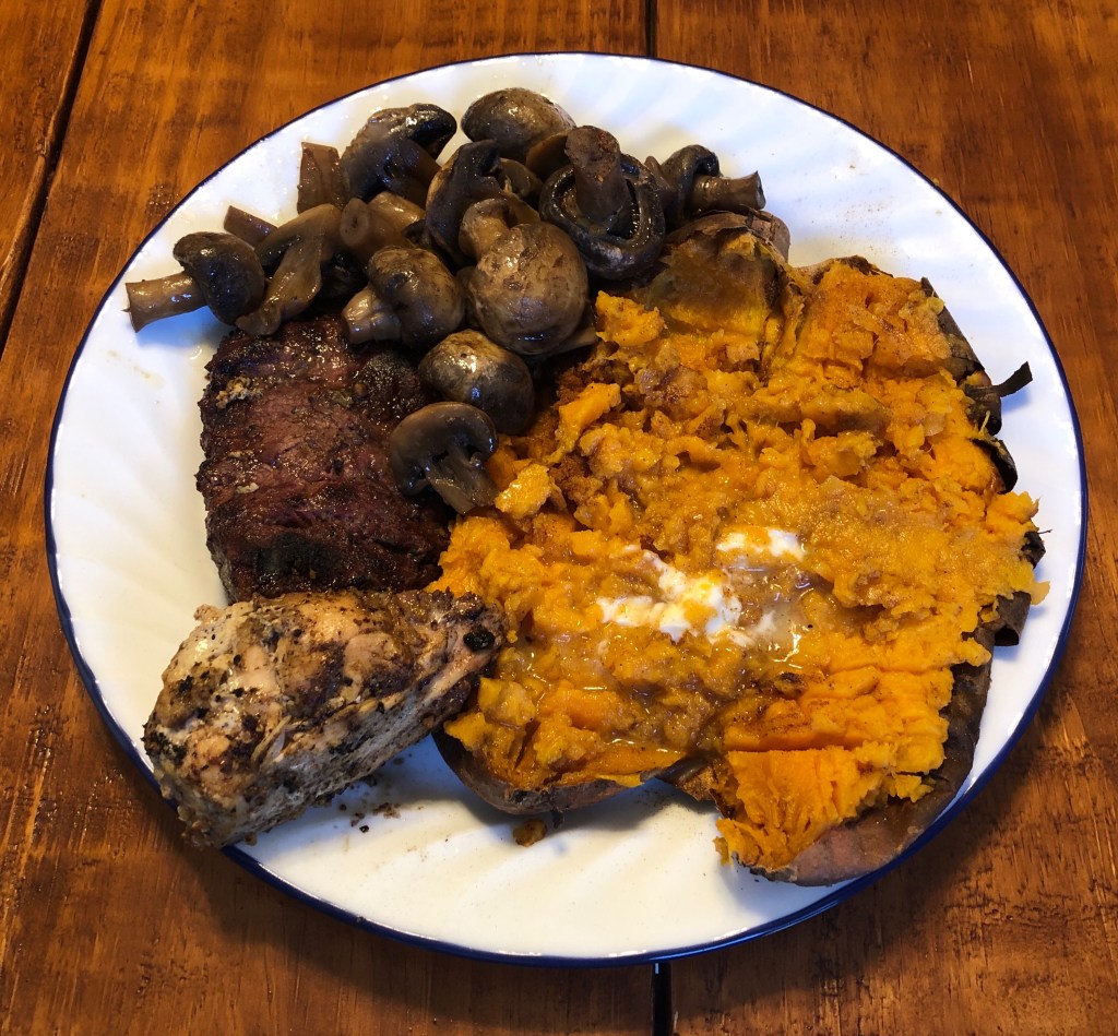 Sweet potato 🍠 in the air fryer with cinnamon sugar and 🧈 butter along with mushrooms 🍄 sautéed in Worcestershire Sauce and butter again.
