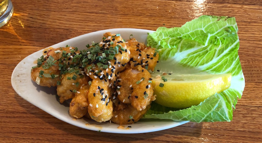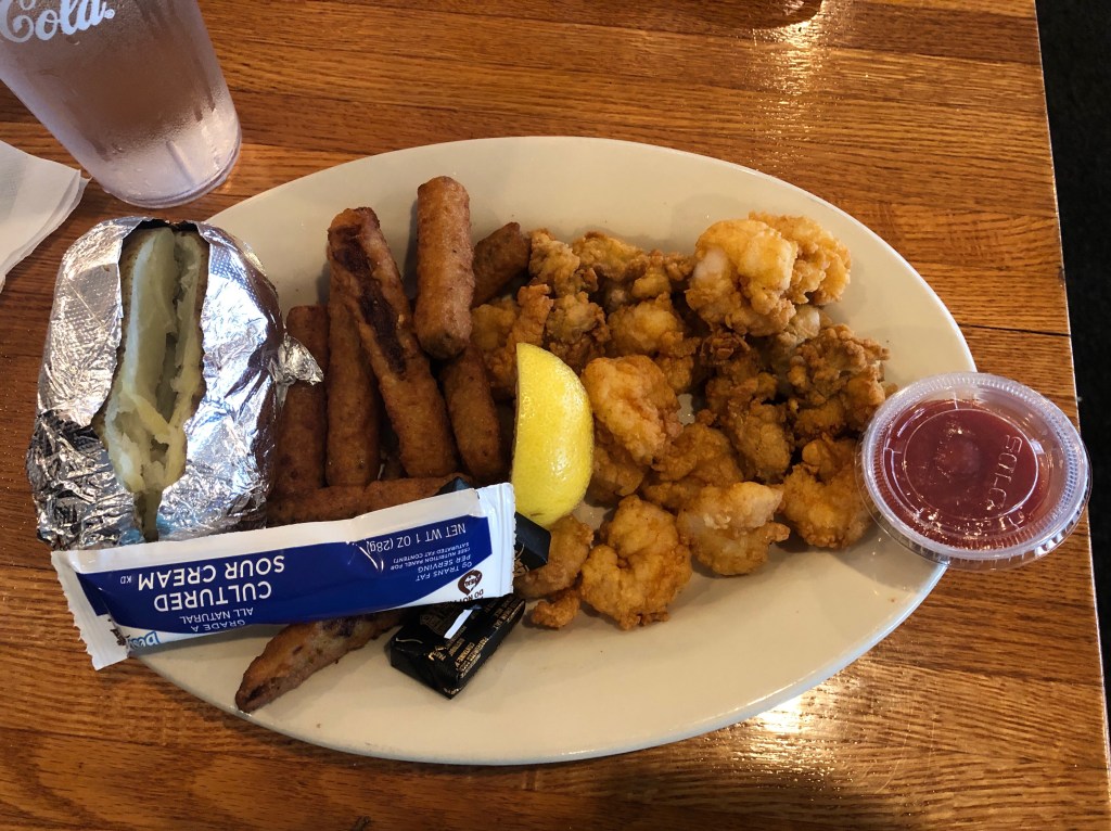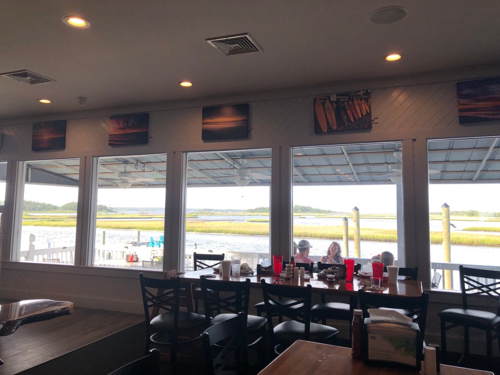 JM’s On the Water is located on the sound and just north of the Topsail Island bridge. You can get a seat outside along the dock or inside. We chose inside due to a 🌬 windy evening. Actually, after we came in from the beach 🏖 for lunch and also before 🌧 rain, it has been a bit windy the rest of the day.