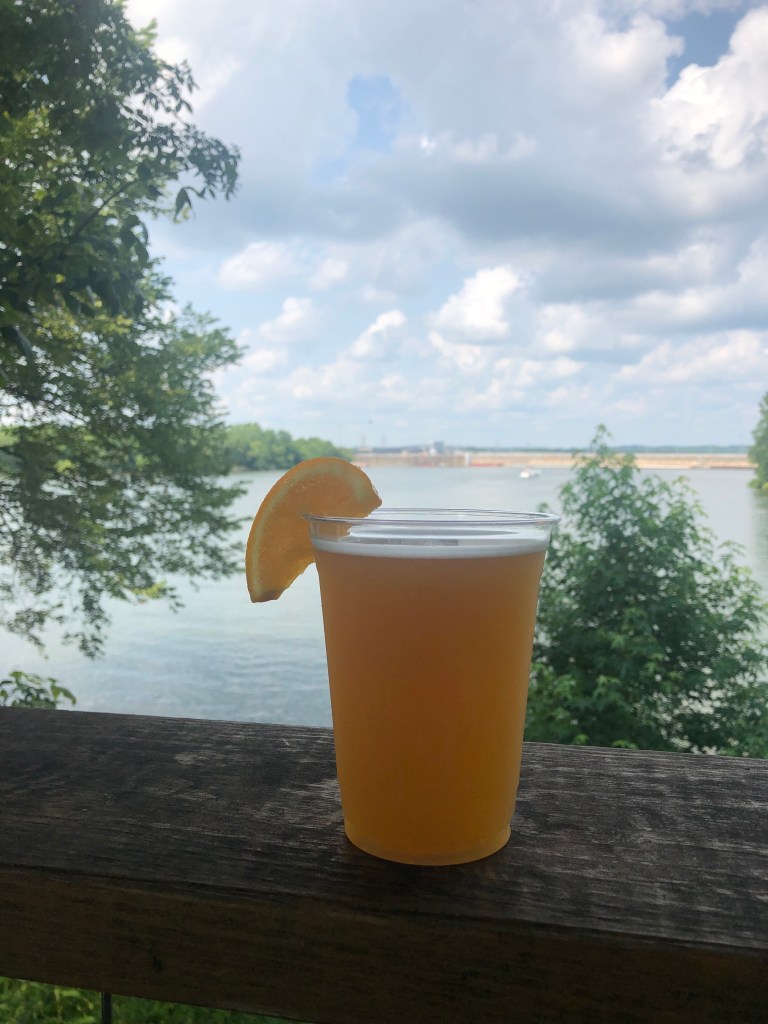 A Blue Moon sporting an orange 🍊 slice with Barkley Dam in the background.