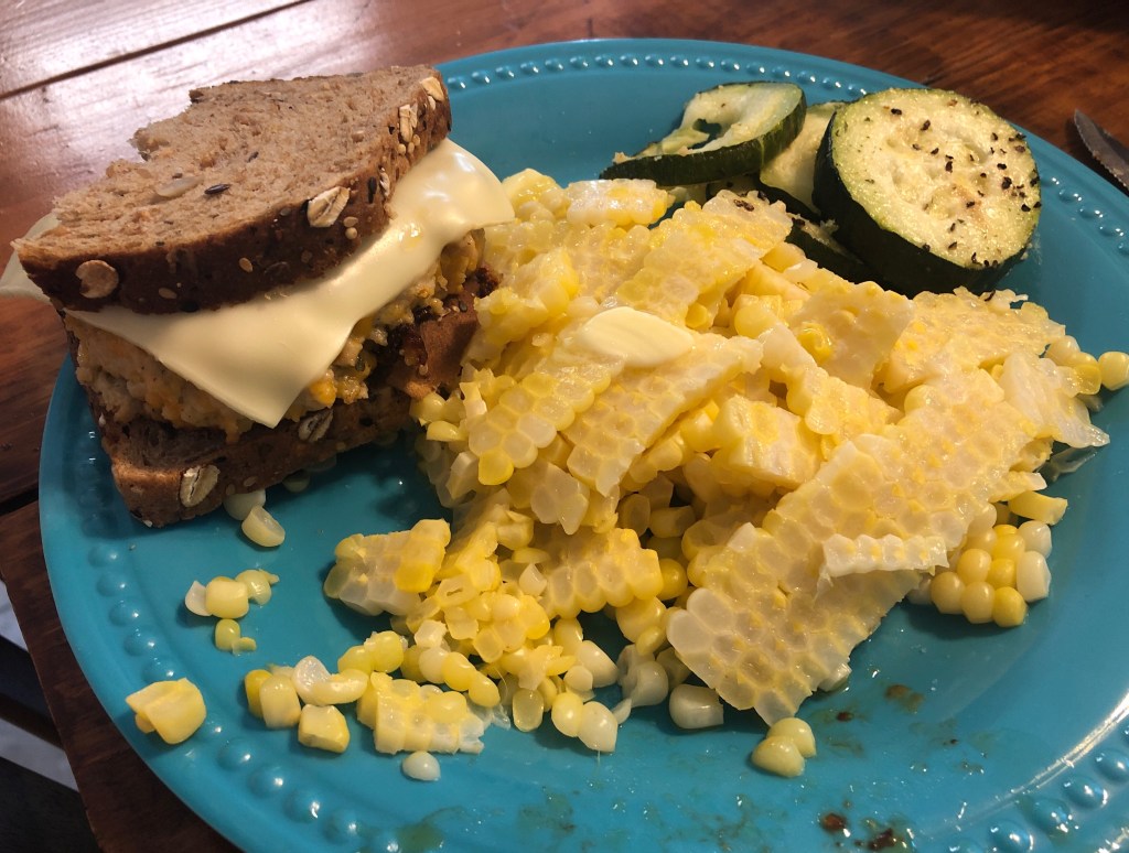 Heidi had these bad boys on the griddle when I got home. Can’t wait to try them on the grill.Can you see the steam rising on the pyramid of sweet 🌽? A make-shift bun with some Dave’s Awesome whole grain bread and a slice of cheese tops off the burger. I prefer my corn sliced off the cob. Baked Zucchini with some salt and pepper.