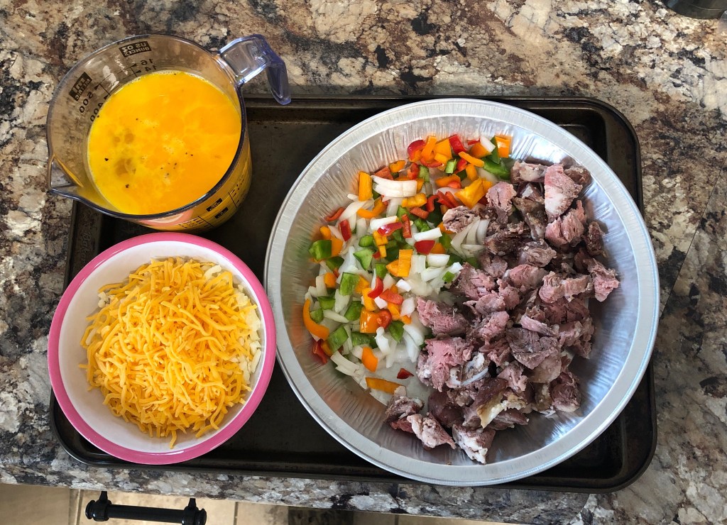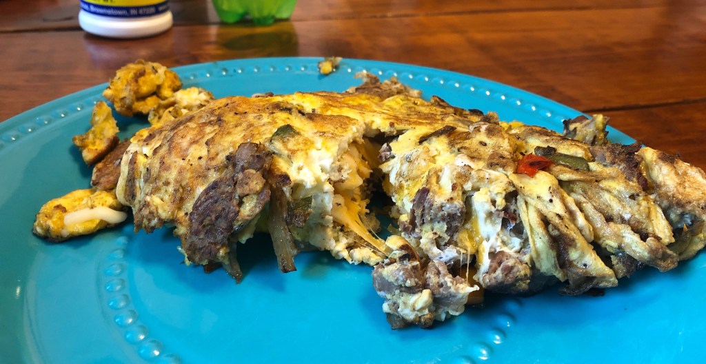 Ingredients: 🥚 eggs from the Clay Fritz family chicken 🐓 coup, Orange, green and red 🌶 🫑 peppers from the Hackman/Wintin garden, 🧅 onion, diced Cowboy 🥩 steak and shredded cheese. The eggs were seasoned with Marion-Kay spices.