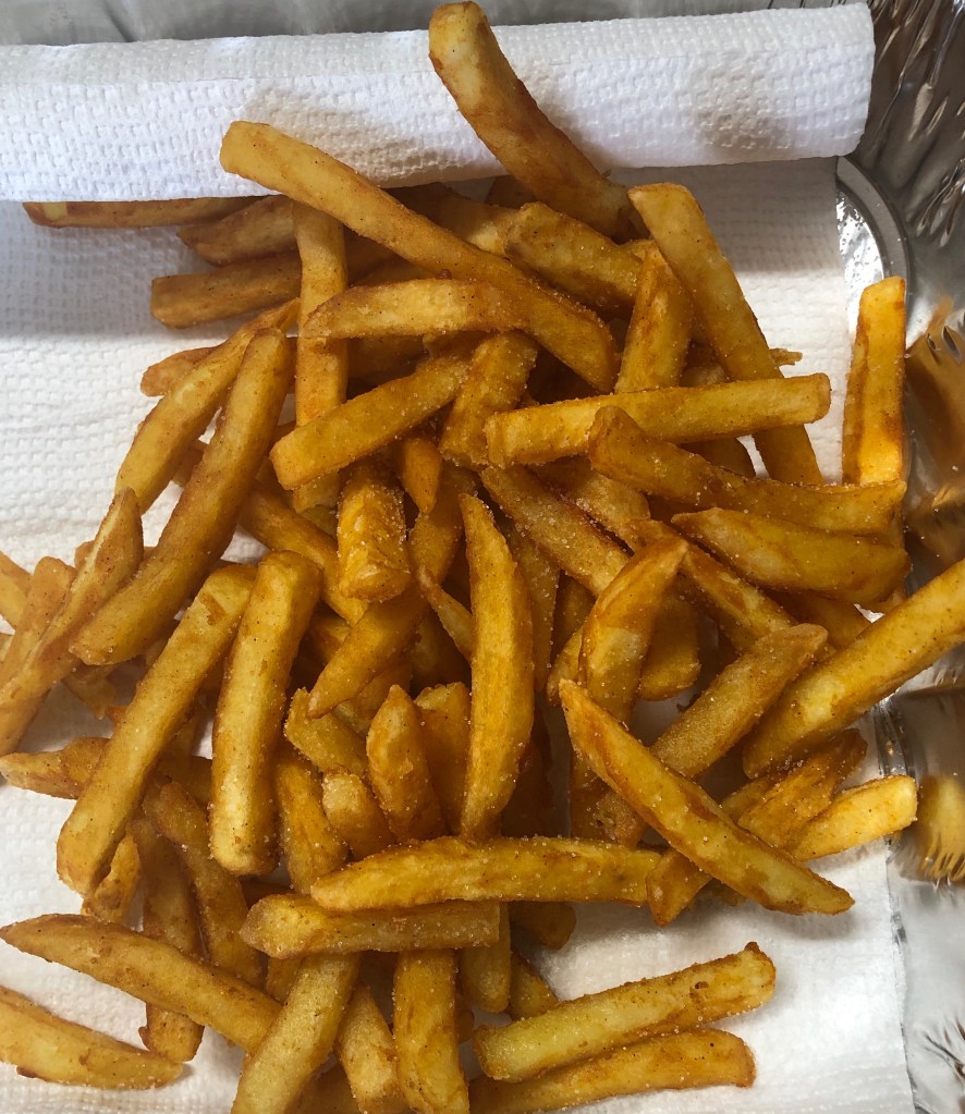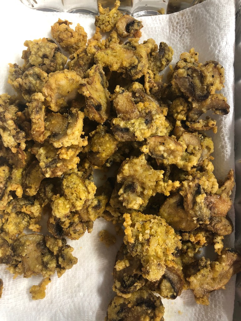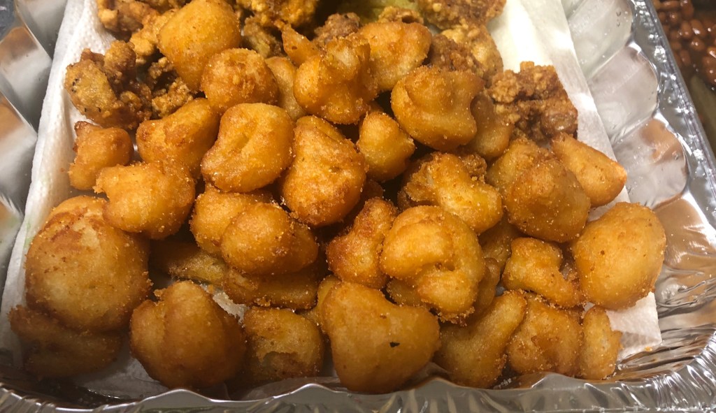 Nothing healthy here tonight. But with the Saints/Packers game on at Brother Bo’s Bar (Richard’s Garage) and Bruce and Richard frying, there were about 20 people enjoying Sunday Supper and getting ready for the work week ahead.