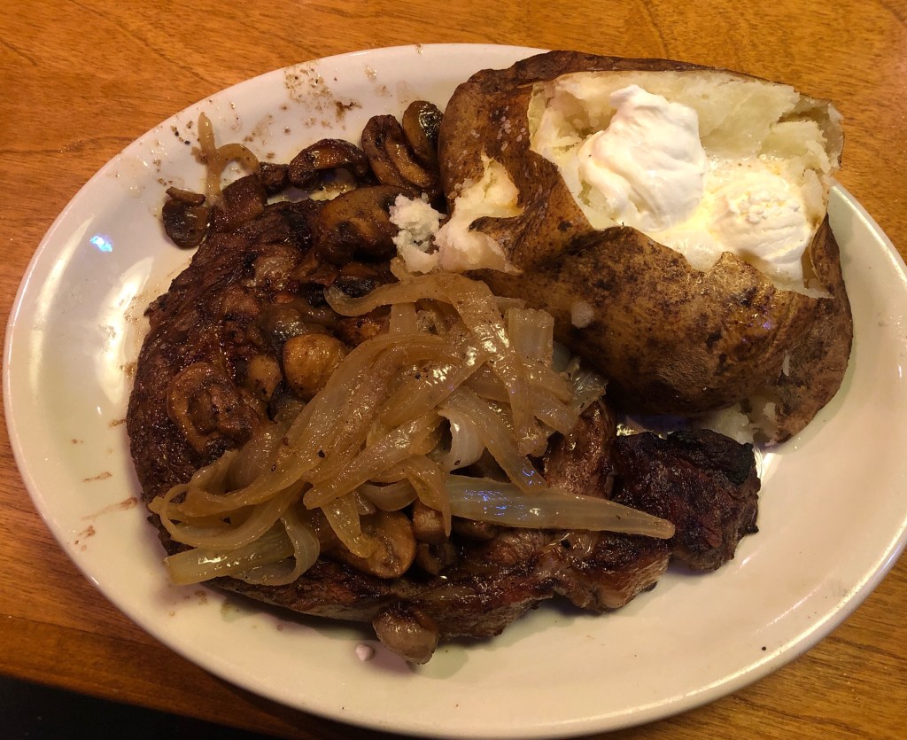 With that, the peanuts 🥜 and hot rolls with cinnamon butter were incredible as I anticipated the steak. Smothered in mushrooms and onions was the way to go. And, we didn’t even spend all of the gift cards.