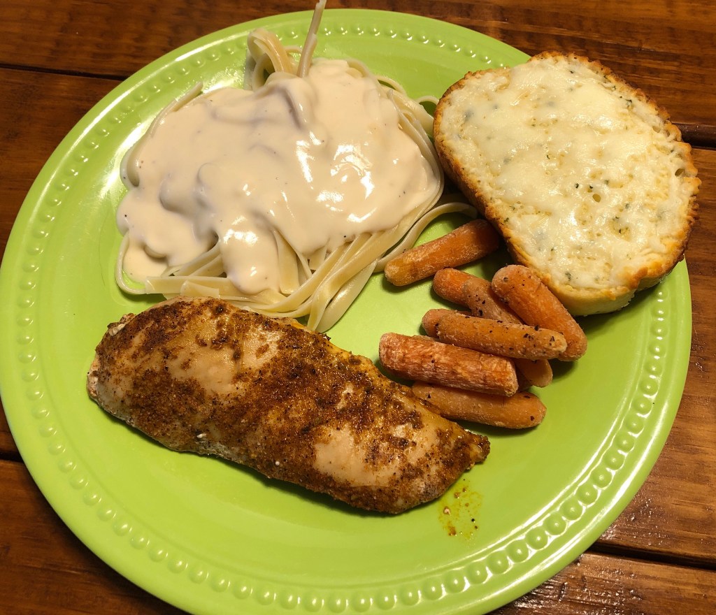 Tonight’s line-up is Blackened Chicken, roasted 🥕 carrots with 🧂 salt, pepper and garlic powder, fettuccine Alfredo and Oh! At the last minute, “Do we need some 🧄 garlic bread?” Well, yes. Yes we do need some garlic 🥖 bread.