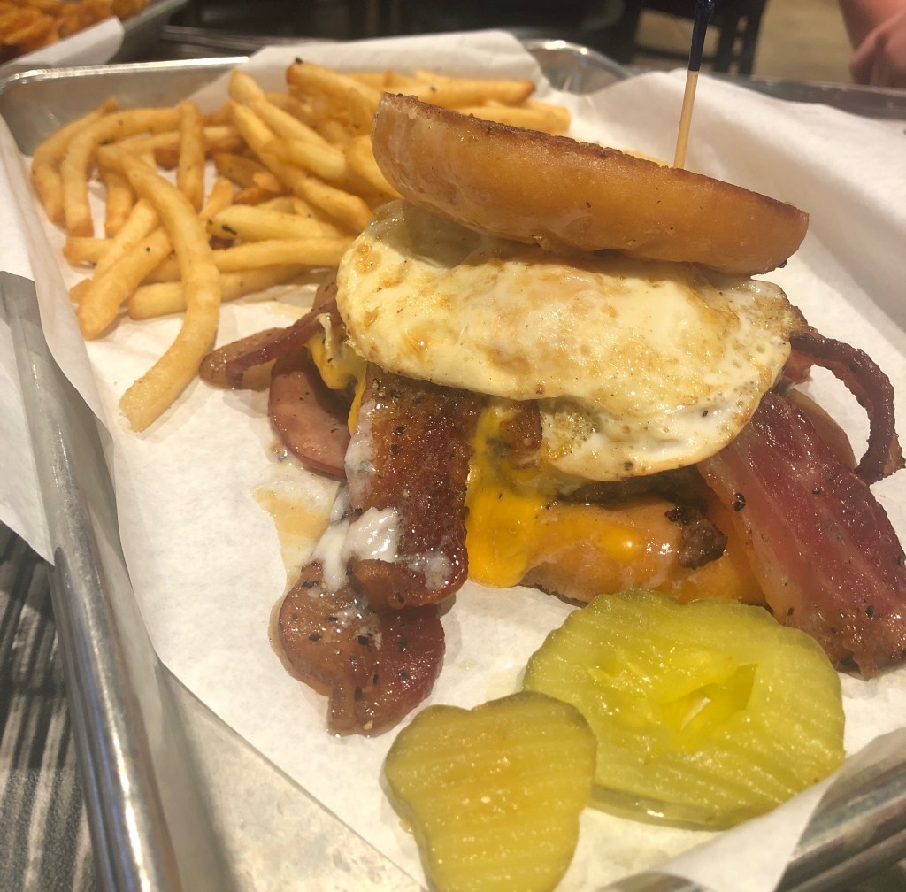 The Sickies Garage back story.Chandler had the 😵 Hangover which is a 🥓 bacon wrapped burger topped with grilled ham, 2 🍳 fried eggs, American 🧀 cheese and served on two glazed doughnuts 🍩.I had the Wild Hog 🐽 🍔 burger which was a 🥓 bacon cheeseburger on a 🥨 pretzel bun. Delicious!!! And with sweet potato 🍠 fries.