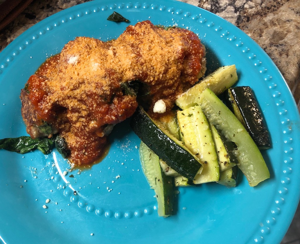 Heidi made the delicious meatballs with ground 🦃 Turkey, minced 🧄 garlic and fresh spinach and baked them. There was more spinach in the skillet (under the marinara)🍳 and baked zucchini.