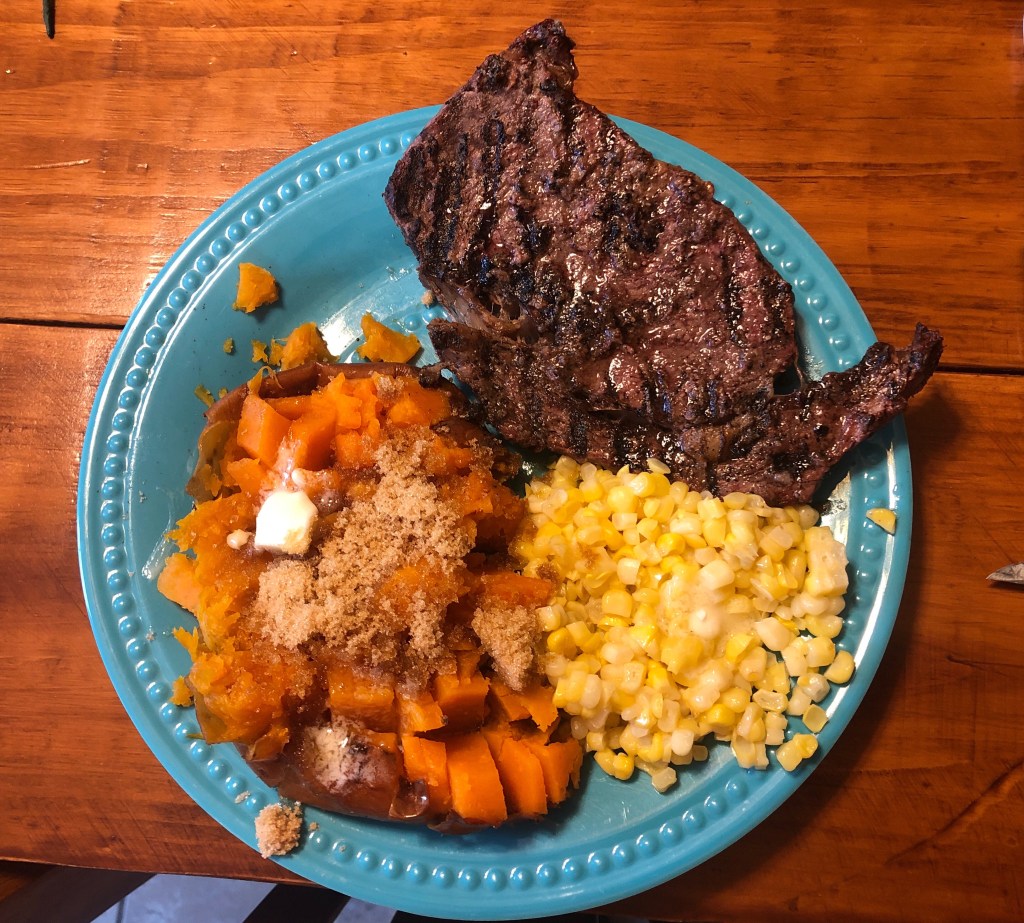 But, Hey! The sweet potato 🍠 with butter and brown sugar and the sweet corn from last year’s garden didn’t even need the steak to make a wonderful meal. Hey!