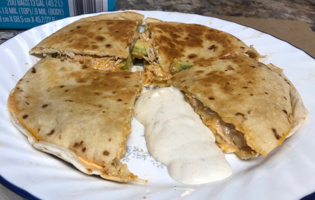 A Pat of 🧈 butter in the skillet, canned chicken, 🧀 cheese, avocado 🥑, taco sauce and then a blob of Ranch dressing to dip in.