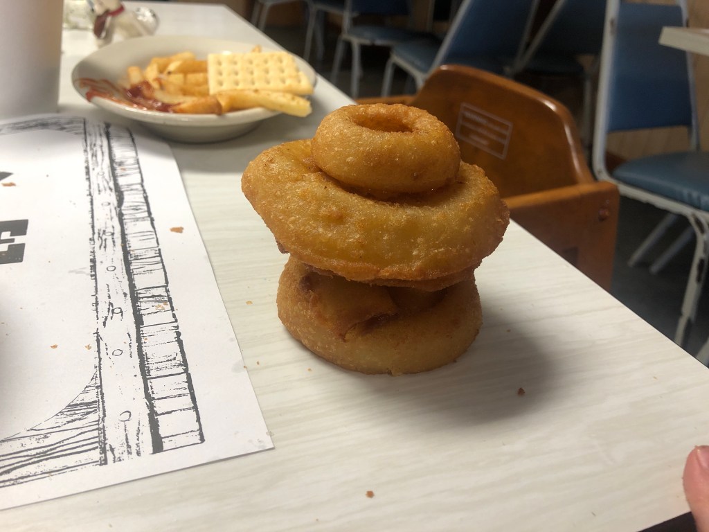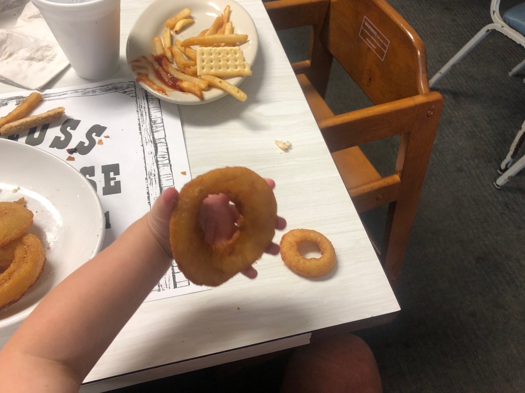 I ordered a 🥓 bacon cheeseburger 🍔 with BBQ sauce on the side and onion rings and French fries for the boy. Our server also brought him crackers and applesauce which he insisted on feeding himself.