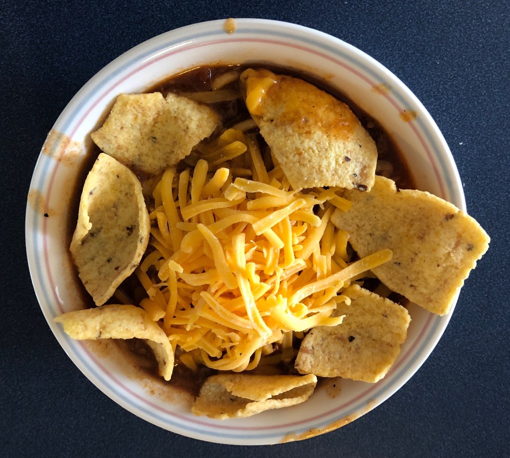 Nina made a pot of chili soup to which I added shredded cheese and corn chips.