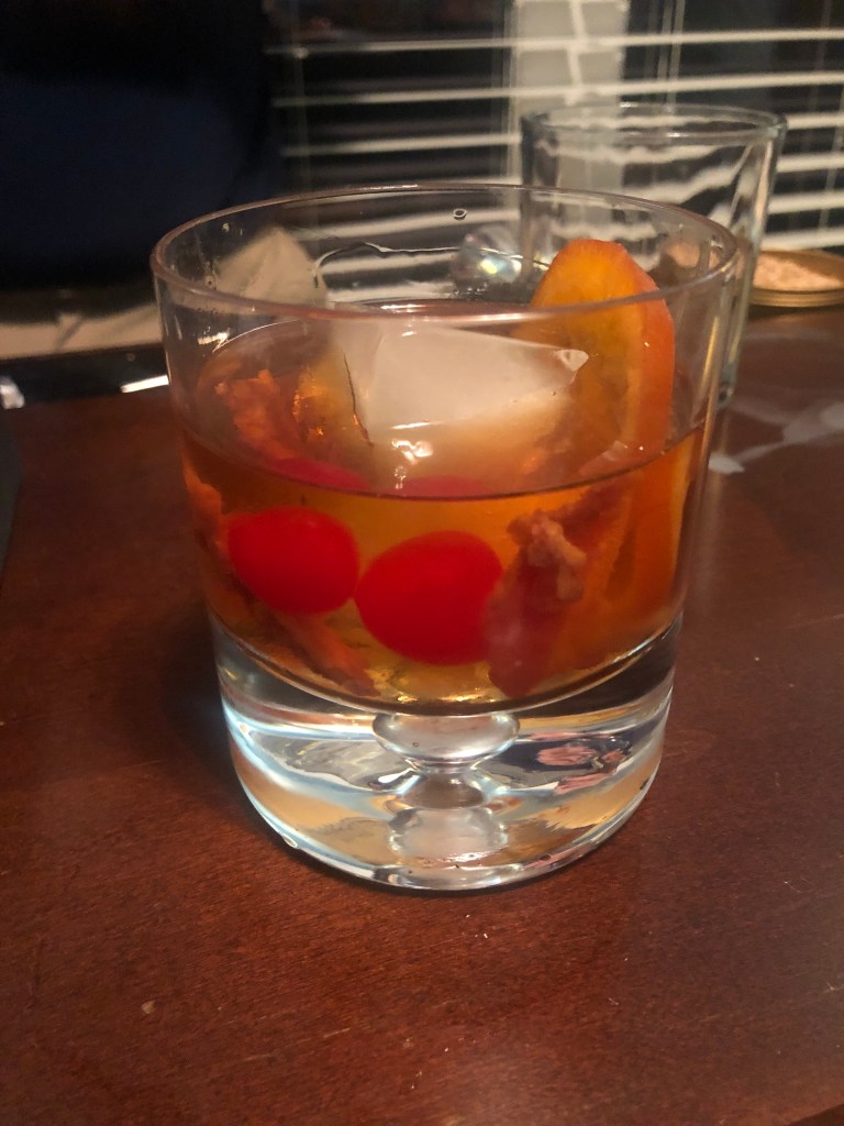 The ingredients are bourbon of your choice, (tonight it is Knob Creek), JCT ice cubes, ๐ cherries, candied orange slice ๐, simple syrup, cherry smoke, and a maple ๐ sugar bacon ๐ฅ slice.