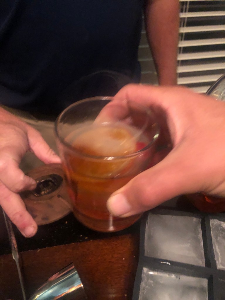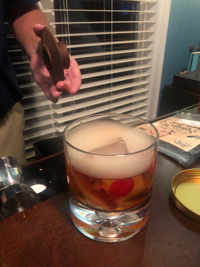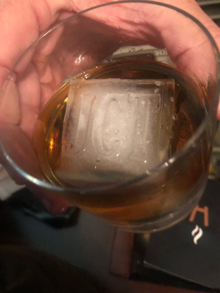 Chris Schuck enjoying a smoke infused Old Fashioned.Thatโs a big JCT ice cube!Jon Charles Tilmon has JCT on his giant ice cubes. Everyone needs a little Chicken Cock in their life!Meet Jon Tilmon. The best friend and host that Walt, Bruce and Chris could ask for. He is putting ๐จ smoke into the drink. That is cherry ๐ smoke lingering on top of the Old Fashioned. A slice of candied ๐ฅ bacon, ๐ cherries and a candied ๐ orange slice are visible along with the JCT ice cube.Smokin!!!Chris gets all of his senses going as Bruce is waiting in line for his.Did I mention that we are watching football ๐?