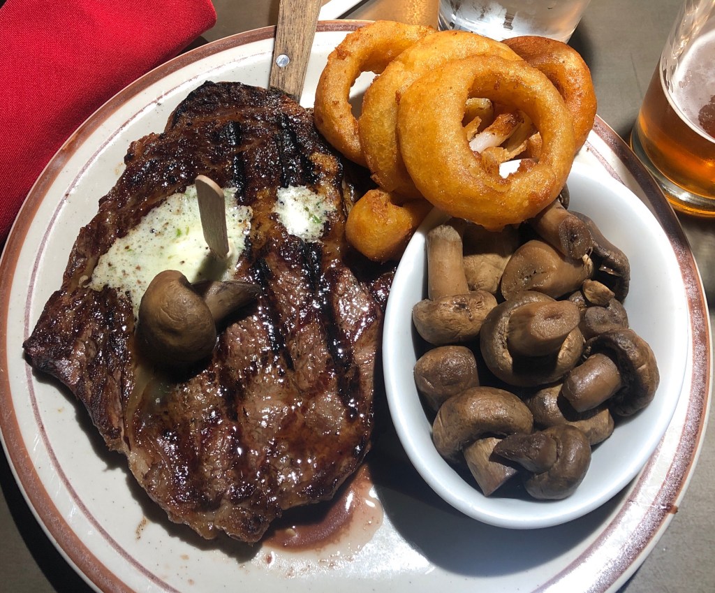 I had the Big E rib-eye, 🧅 onion rings and 🍄.