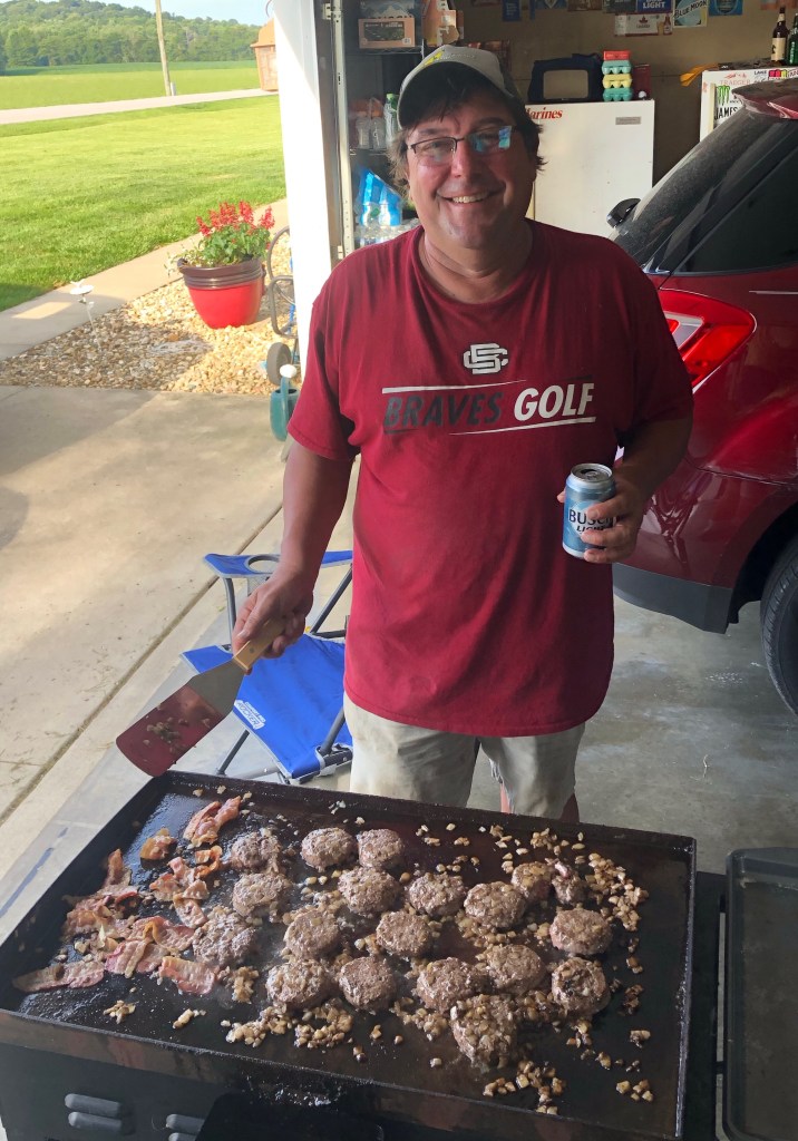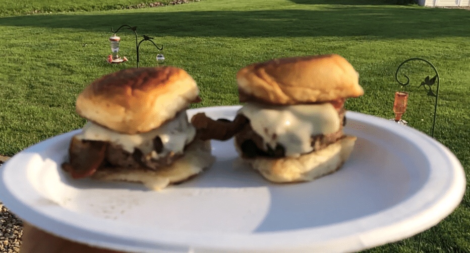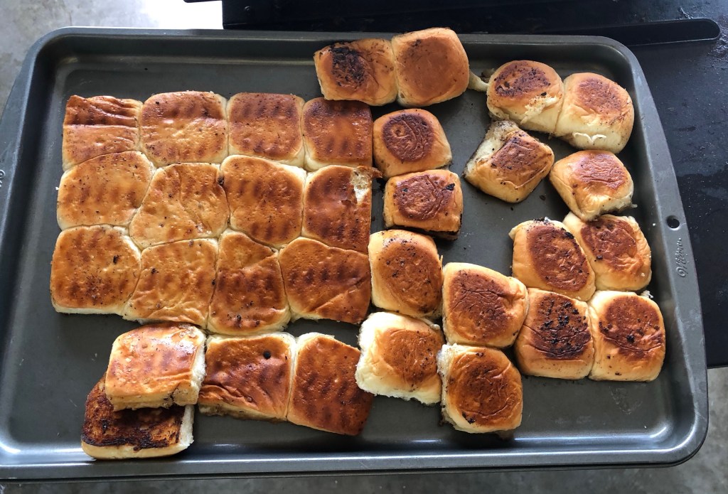 We had some prime rib ground beef slider Pattie’s atop diced 🧅 onions on the Blackstone, 🥓 bacon, add American cheese, and THEN, we toasted an entire package of King’s Hawaiian Rolls.