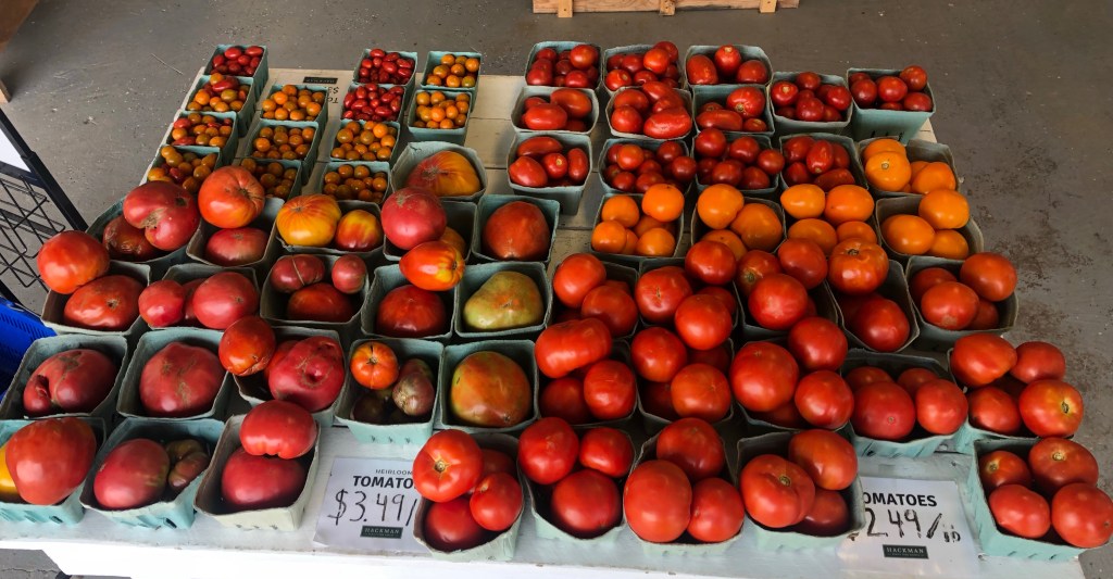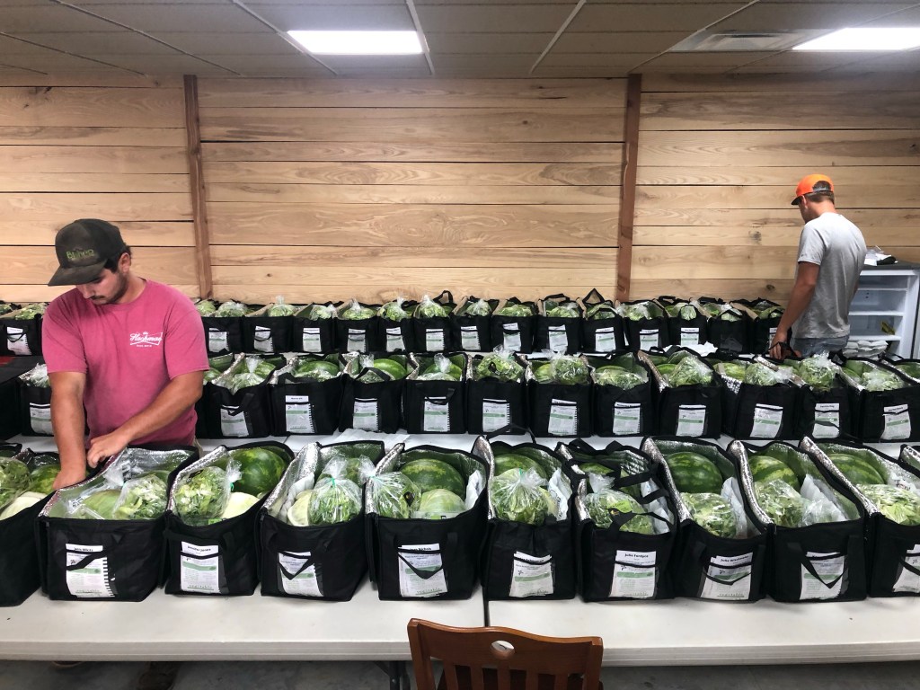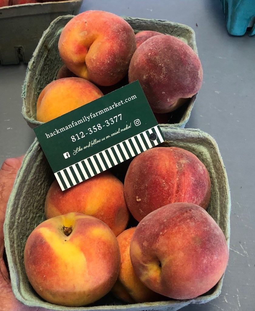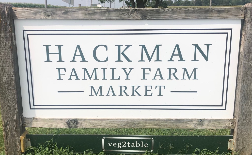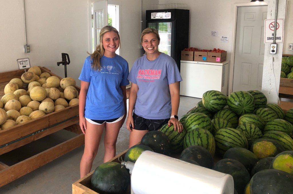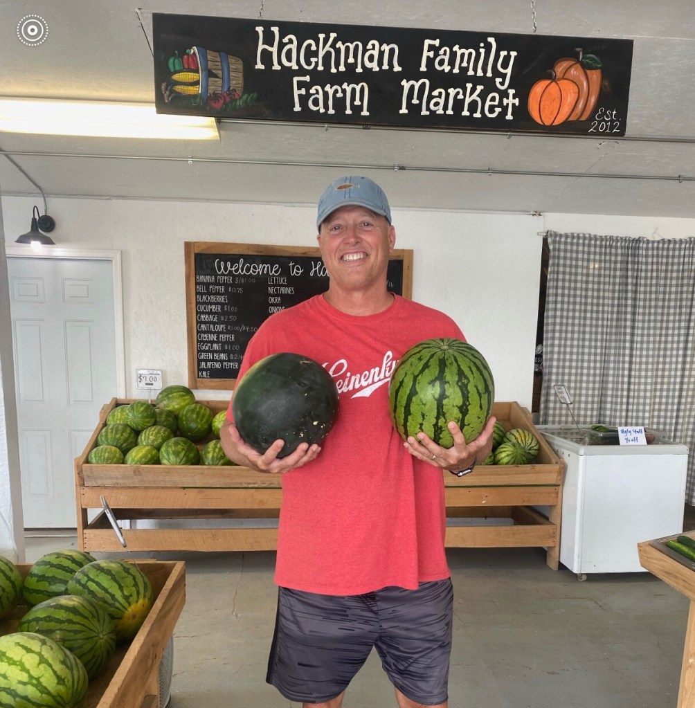 Service with a smile is what Abby and Jacquelyn are offering along with cantaloupe 🍈, 🍉 watermelons, 🌽 sweet corn, etc. Not to mention local jams, marinades, Marion Kay spices and Hackman’s Family Farm Market T-shirts with clever sayings on them. The market is located at the corner of State Road 135 and 600 South about a mile or so north of the Muscatatuck River and south of Vallonia.Here is a sample of a Veg2table package which included: lettuce, 🍉 watermelon, cabbage, potatoes 🥔, green beans, 🌶 peppers, locally canned relish, dill and eggplant 🍆. There were also blackberries.Cayleb Covert and Liam Kreis fill Veg2table bags for Thursday’s delivery. While delivering Veg2table bags this week, I drove past Beck’s Mill in Washington County. Hackman’s delivery area includes Jackson and Washington counties.Fresh tomatoes 🍅 in the market.🍑 🍑 🍑 Hackman Family Farm Market, “More than just melons!” Be sure to get your cool Hackman’s T-shirt!