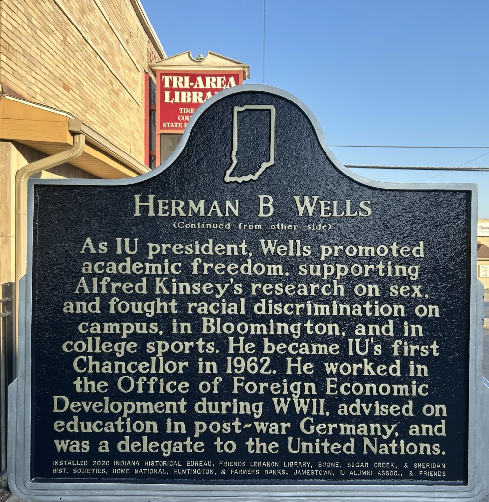 Jamestown is the hometown of Herman B Wells, former Indiana University president and educator. As well as the info stated on the historical marker, he was also the president of IU in 1947 when Bill Garrett of Shelbyville was Mr. Basketball and became the first African-American basketball player in the Big Ten for IU. Along with Coach Branch McCracken, Wells was a key player in making that happen.