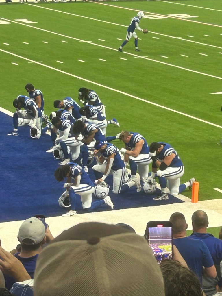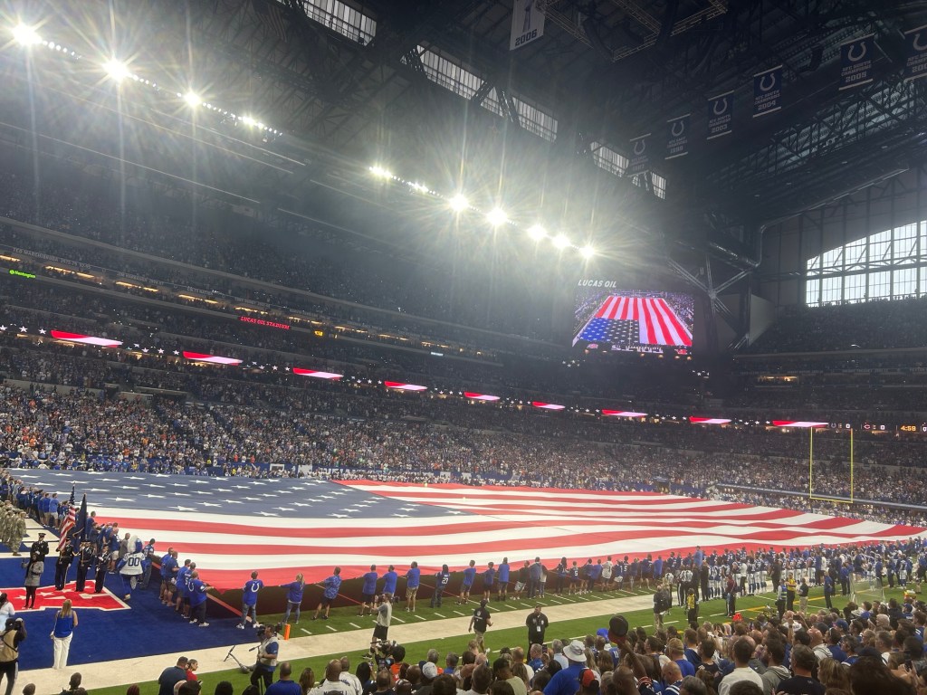 Former Colts running back Edgerin James has a talented daughter that sang the National Anthem. He was there when Eyahna sang a beautiful rendition of the song. The best part for me was when the flag bearers started waving the huge flag when she sang โdoes that star spangled banner yet wave.โ