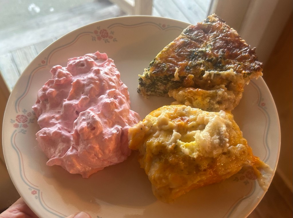 I started with the pink fluff. Some combination of jello, cool whip, bananas 🍌 and strawberries 🍓. Whoop! Whoop!🙌