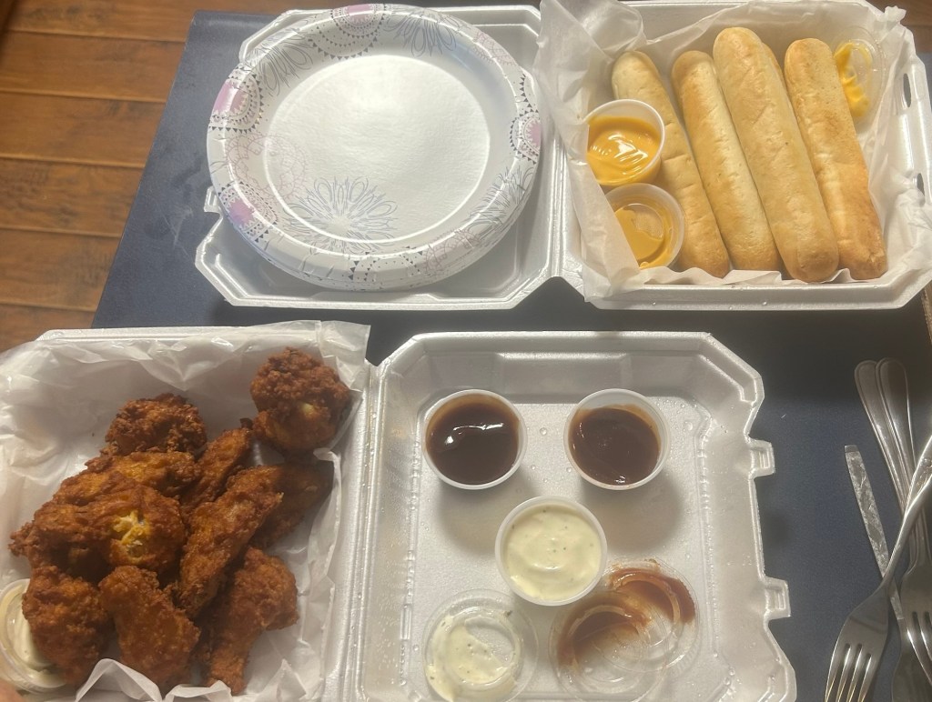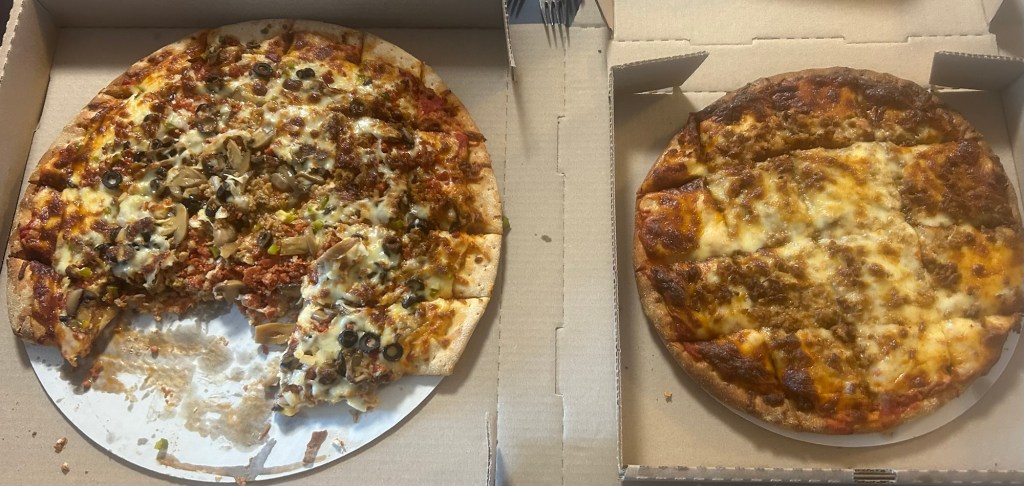 Bruce Stahl, Ken Hackman and myself played 18 holes 🕳️ at Hickory Hills today. The camaraderie as well as the golf ( I went 45-44 for an 89) was a great time! We stopped At Tiemeyer’s Pizza 🍕 on the way home and ordered some pizza, breadsticks 🥖 and some wings 🪽 🍗 on the side. All was delicious and was a special occasion with Ken being home for a few days from California.