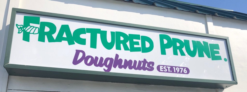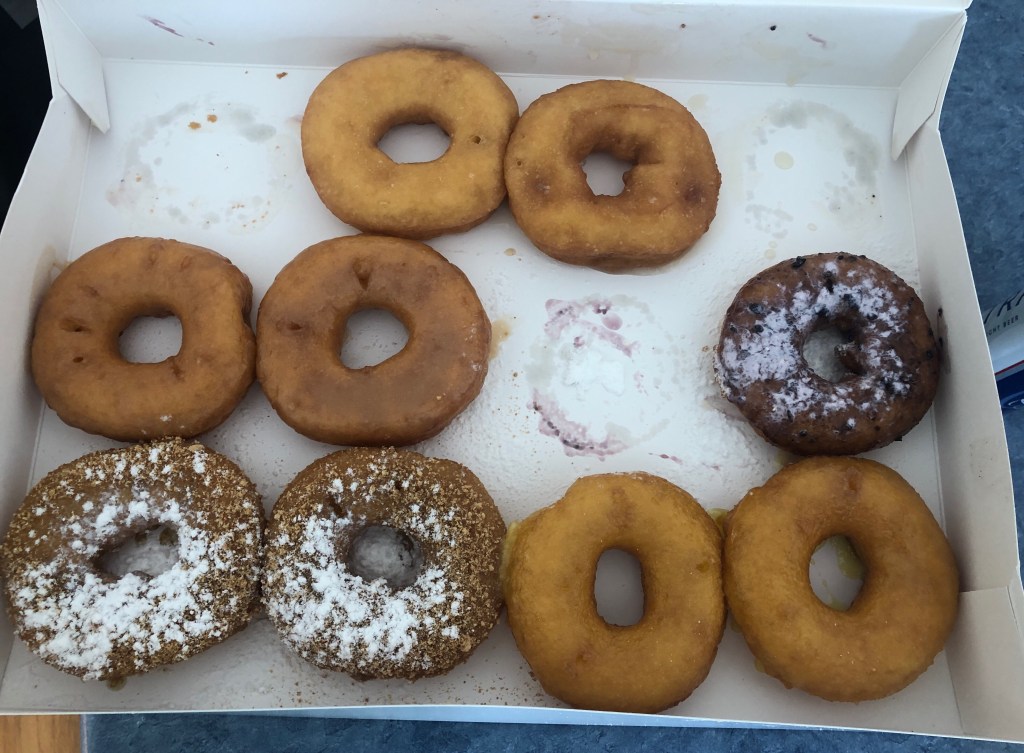 These doughnuts were steaming 🥵 hot and made to order. We just kind of hovered around the box until they were gone. Multiple flavor opportunities as all the doughnuts are the same and they personalize the topping. Cool story on why it is named the Fractured Prune. A competitive woman in her 70s named Prunella was a champion 🏓 ping pong player as well as other sports and would compete against men and often win. She would some times get injured/ fractured and was know as Fractured Punella.