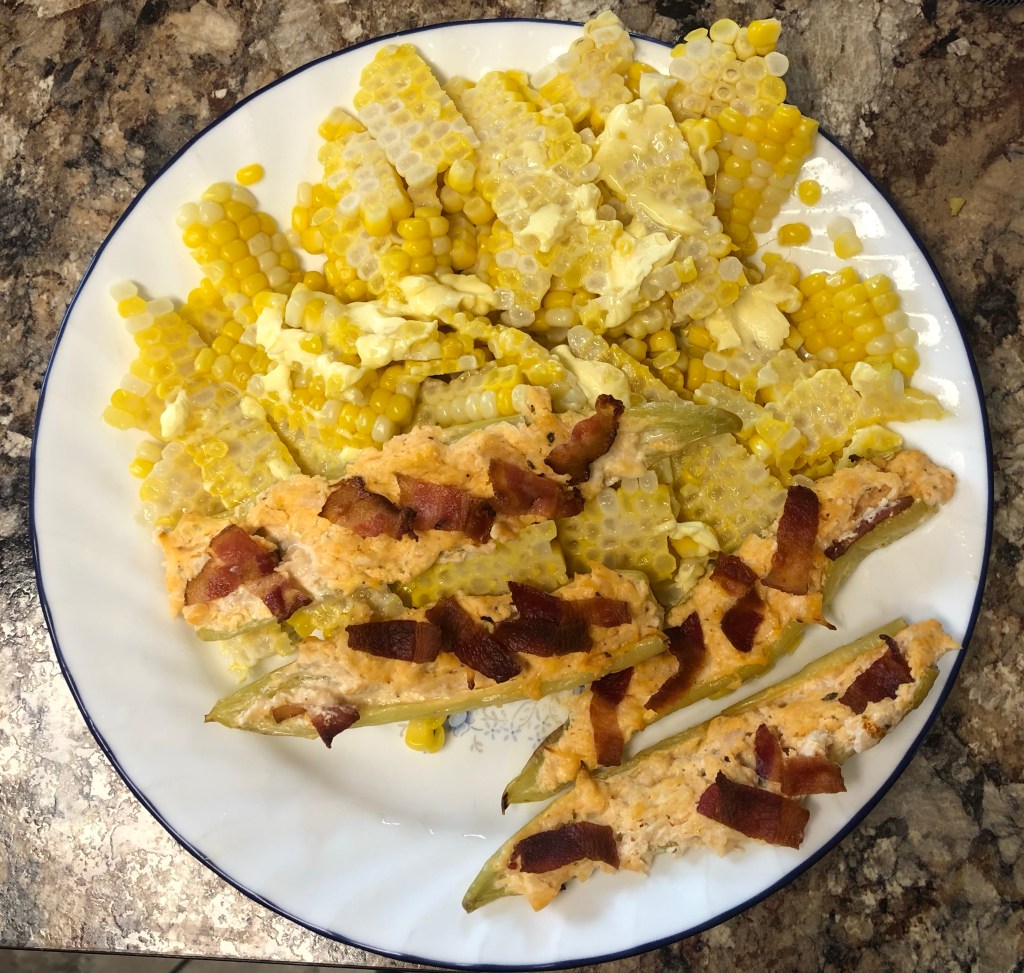 Three ears of corn sliced off the cob and the stuffed buffalo chicken banana pepper.